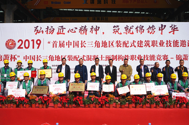 2019年11月16日上午,伴随着庄严的国歌声,首届 “锦萧杯”中国长三角地区装配式混凝土预制构件职业技能竞赛-浙江分赛区预赛闭幕式在锦萧科技海盐装配式预制构件生产基地顺利举行。