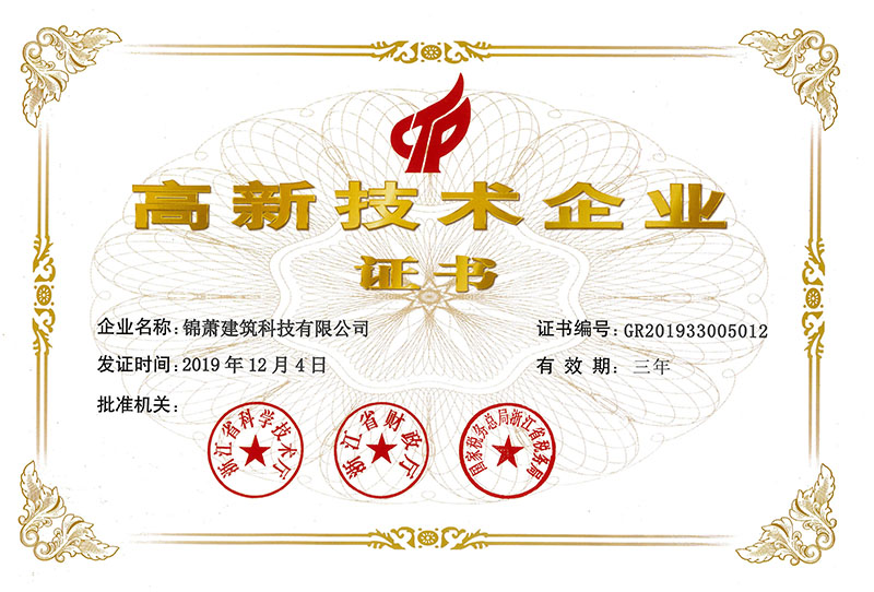 2019年12月,锦萧建筑科技有限公司成功通过高新技术企业认定,并于近日收到由浙江省科学技术厅、浙江省财政厅及国家税务总局浙江省税务局颁发的“高新技术企业”证书。