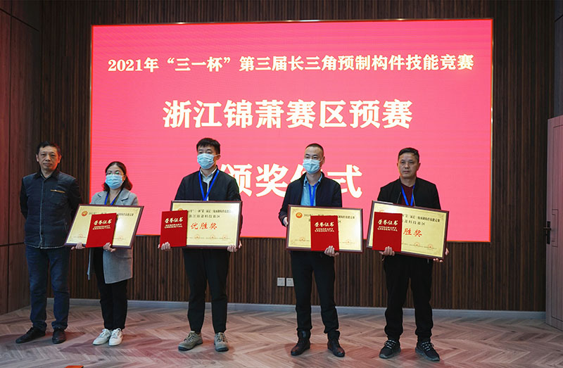 经过激励的角逐,最终浙江永坚新材料科技股份有限公司,锦萧建筑科技有限公司,浙江建枫装配式建筑科技有限公司参赛队表现突出,拿下比赛前三。赛后,作为承办方,锦萧科技总工程师王建忠分别为获奖参赛队颁发了荣誉证书,同时获得前三的参赛队成员也将获得由海盐县人力资源和社会保障局给予的奖金奖励。