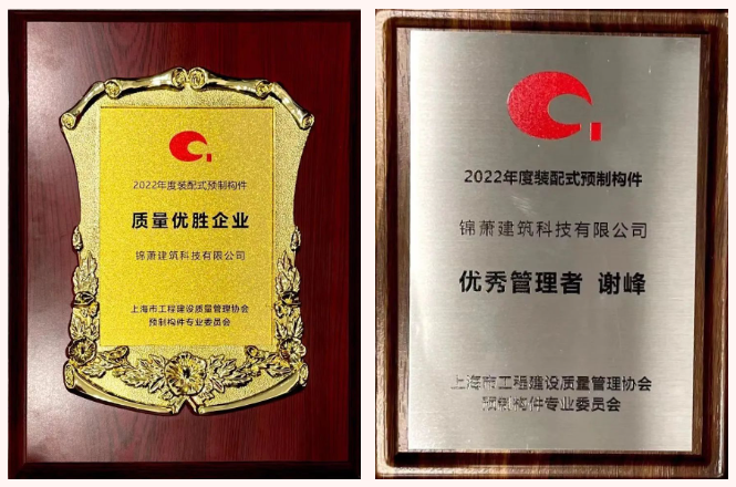 锦萧科技荣居榜首,被评为“2022年度装配式预制构件质量优胜企业”,并授予公司副总经理谢峰“优秀管理者”称号。