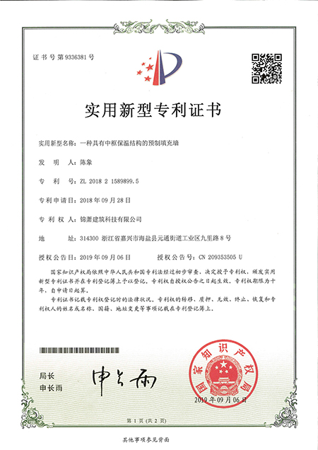专利证书--一种具有中框保温结构的预制填充墙