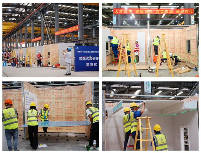 本次竞赛包括理论考试和实操考核两个部分,理论考试占总成绩的30%,实际操作占总成绩的70%。开幕式后,紧张激烈的实操考核正式拉开帷幕,参赛选手们按序就位,迅速投入到各自的“战场”。从材料到成品,是一次对参赛选手技能水平的大检阅,也是一次促进技艺提升的展示交流,展现了装配式建筑产业工人各个工种的技艺魅力。